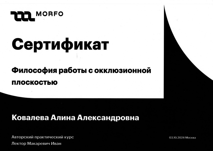 2021 г. — окончила Московский государственный медико-стоматологический университет им. А.И. Евдокимова по квалификации «Врач-ортодонт» (ординатура).