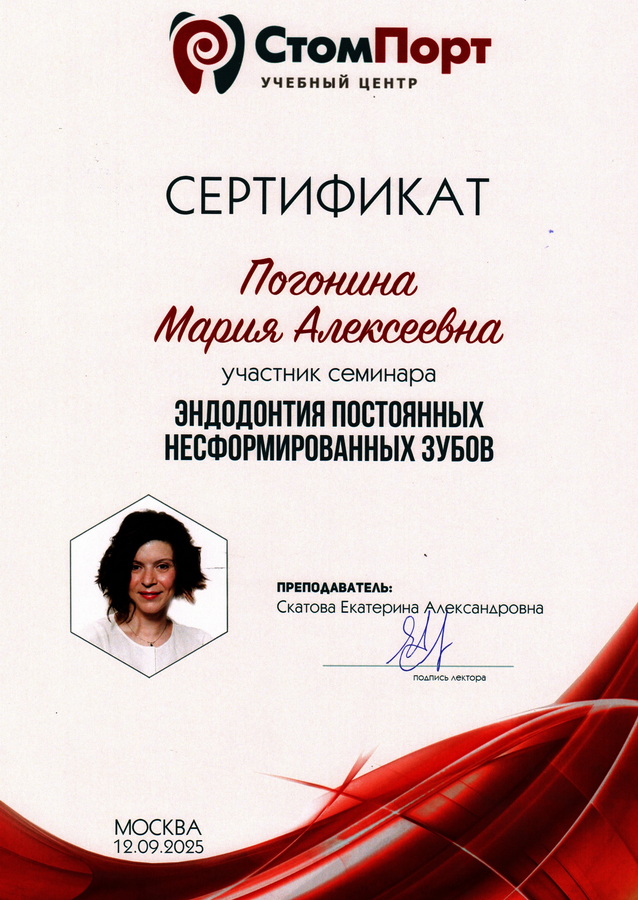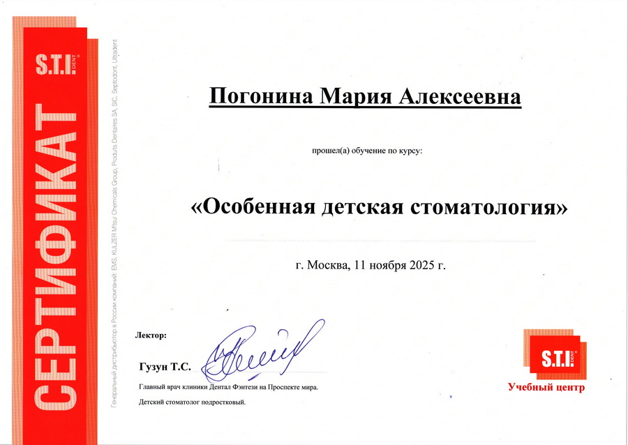 2014 г. — прошла профессиональную переподготовку по «Стоматологии детской» в ГБОУ ДПО «Новокузнецкий государственный институт усовершенствования врачей» МЗ РФ.