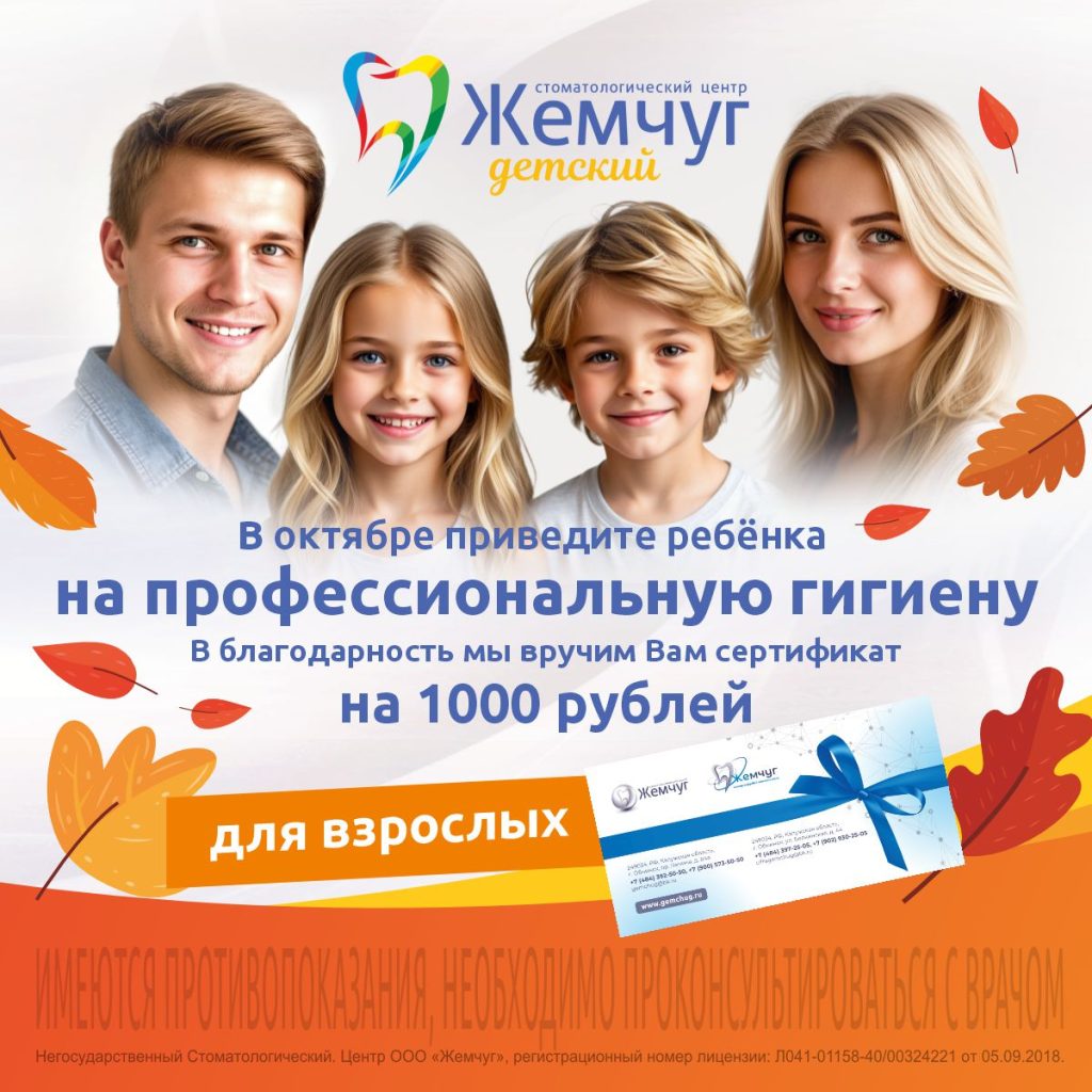 Пусть этой осенью улыбается вся семья! В октябре приведите ребёнка на профессиональную гигиену в стоматологический центр «Детский Жемчуг». В благодарность мы вручим Вам сертификат на 1000 рублей для взрослых, чтобы и ваша улыбка сияла! Создаём здоровые привычки вместе!